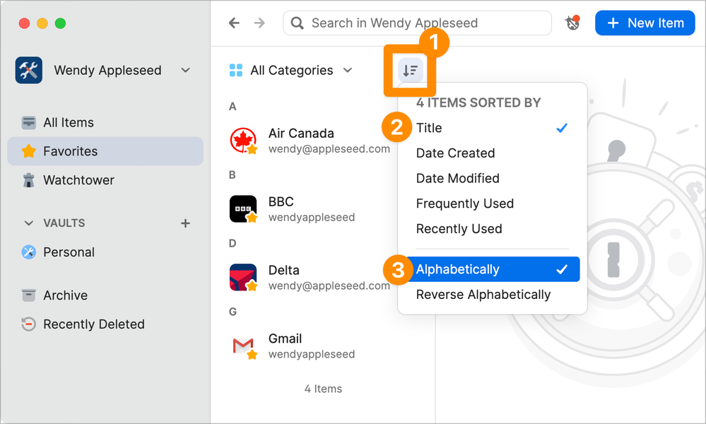 You can sort your Favorites in 1Password 8 for Mac by clicking the sort options at the top of the list, then choosing a sort criterion, like this: