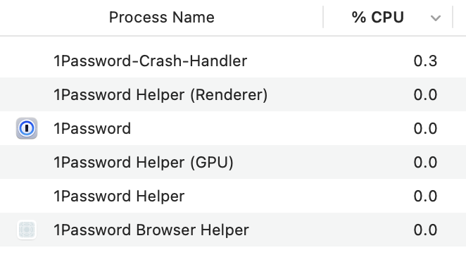Hello Dave--I love your 1PW!!!--I have a 2019 iMac27 with Intel cpu and fusion drive so it slogs along--(waiting for next 27 inch) but noticed 1PW app and updaters at or near top of CPU page many times in Activity Monitor--