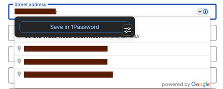 Hi - please see below. In Google Contacts, the address prompt is being mis-identified as a password field, and the undismissable(?) 1PW prompt hides the top-line autocomplete results. This is Chrome ...