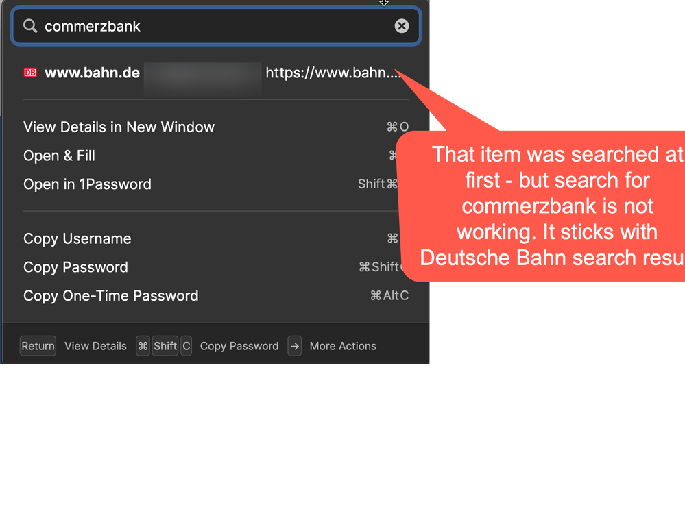 3. Try to search for another item - thats not possible it sticks with the item opened from the first search- There is no way to "purge" the search results. need to restart 1Password complete to have a clear quick access