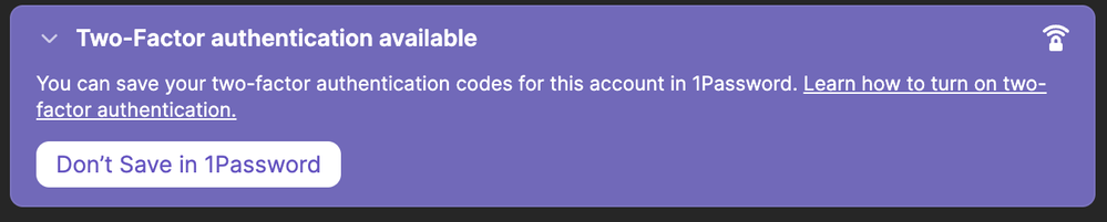 The Watchtower banner for an item says 2FA is available, and yet the button says Don't Save in 1Password, and that feels more like a warning than a directive to 1Password. How about "Ignore for this Login Entry" or something like that?
