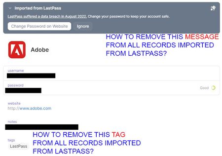 Good work @tanglewood! Following your lead, I deleted the LastPass tag and now the banner is gone on all LP entries. Yay. Fixed.