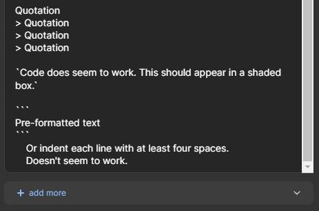 I'm using the 1P8 Windows app and trying out Secure Notes with Markdown but notice that Code and Pre-formatted Text (prefixed with 4 spaces) don't seem to work.