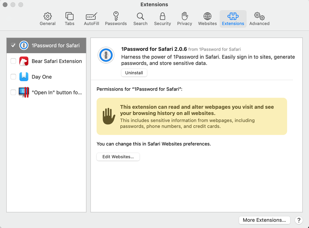 1Password for Safari is our newest browser extension in Safari. You'll use it by enabling 1Password for Safari within Safari's Preferences. Here's what mine looks like, as an example –