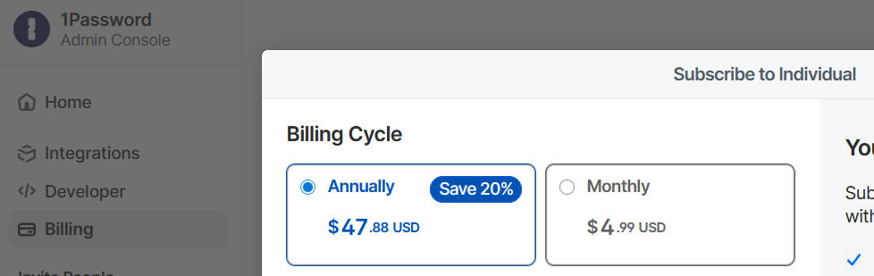 I was considering changing my 1Password personal subscription to an annual plan for https://1password.com/pricing/password-manager.