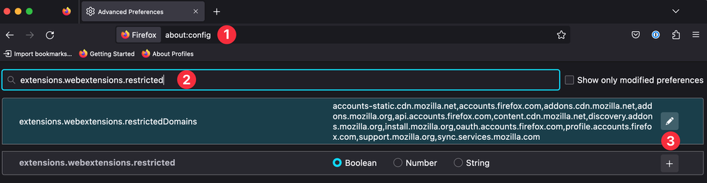 extensions.webextensions.restrictedin the search bar and press enter - Click the pencil icon, find