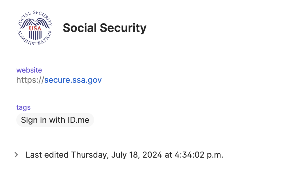 Now the Social Security Administration site is offering logins using ID.me but I can't update my 1Password to reflect this. Can we please have this pushed through dev?