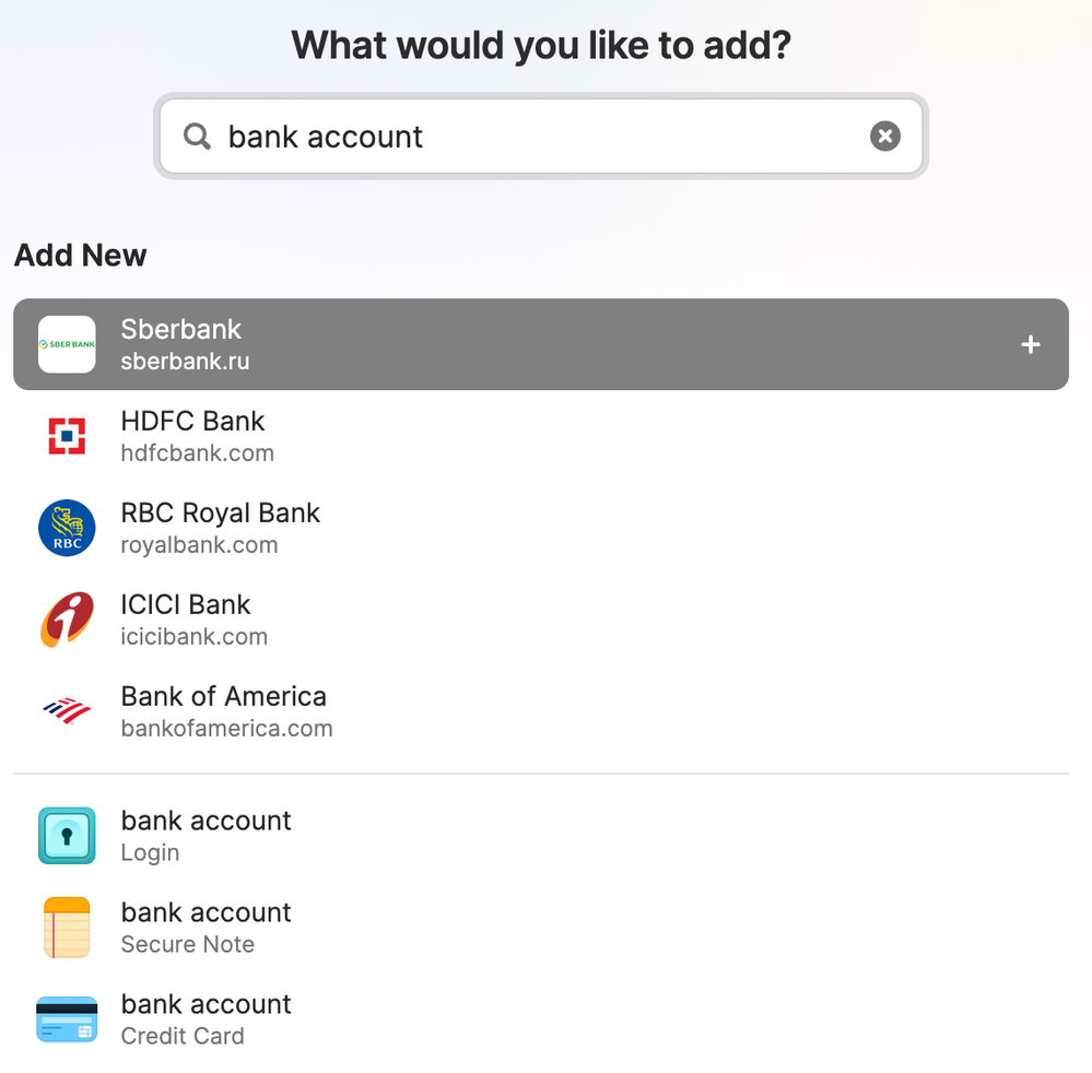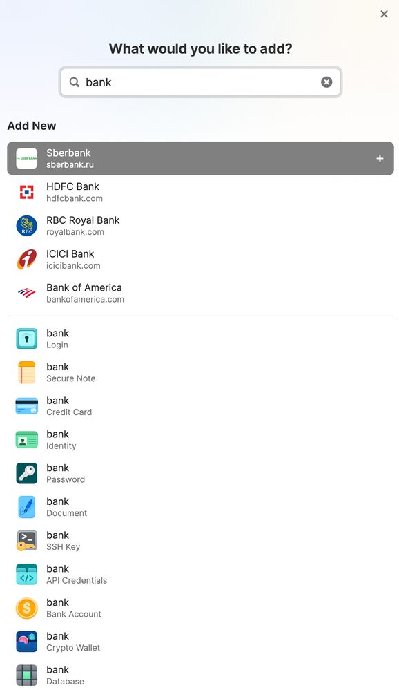 Even if 1Password suggested a more reasonable bank option, is that really the point of this window? To guess what login I want to create based on what I type into the search bar? Do you think users want an algorithm making these decision? (Did Sberbank pay to be listed first??) And anyway, it is not a smart algorithm: I already have logins for one of the websites suggested in the screenshot above (not Sberbank), so why suggest that I make a new one?