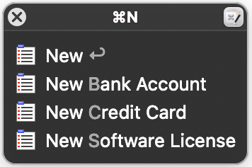 And now setting aside the issue that logins are at the top of the list for no good reason ... why is the rest of the list so poorly ordered as well? Why is "bank account" so far down the list? Do you think I am more likely to want to create an identity with title "bank" ("We are excited to announce the birth of our son, bank!"), than to want to create a new bank account? I do see that the order of categories is the same as in the File -> New menu, so presumably the list is following some default order that is unaffected by the search. That should be fixed too.