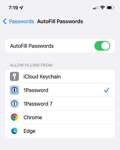 Also, as mentioned in a few other threads, make sure you have 1Password v8 selected for Autofill. The v8 icon is darker than v7.