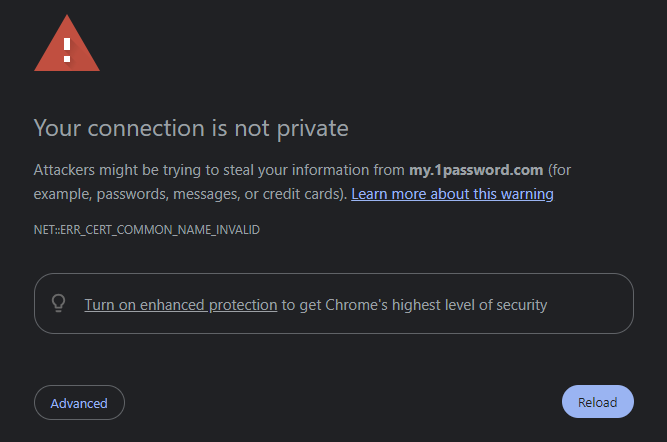 Hi, all of our 1Password apps are showing offline, also unable to sign in to 1password through the browser, Chrome reporting: net::ERR_CERT_COMMON_NAME_INVALID