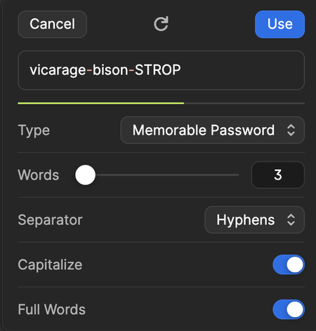 Then, any suggested password you see, or any password you generate will (by default) follow the recipe you've just set.