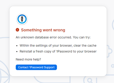 After the update to 1Password in the Browser to 2.14.1, the extension has been reporting an unknown database error. Clicking on the icon in the toolbar takes me to an error page (see screenshot):