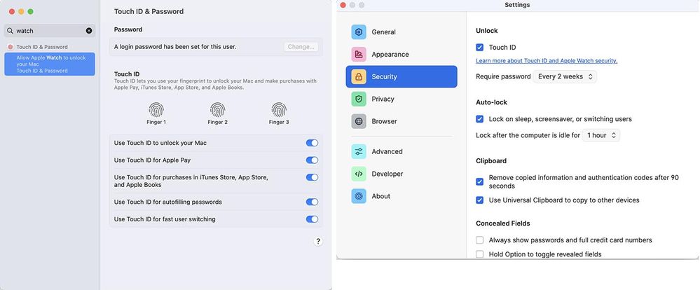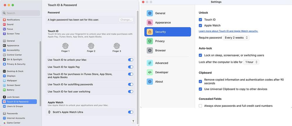 Here are images of macOS + 1Password settings when this occurs.