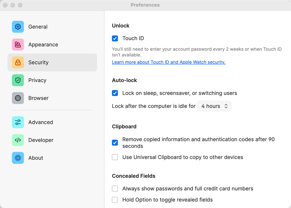 - Disable Apple Watch Unlock in 1Password for Mac (1Password > Preferences > Security > Uncheck "Apple Watch"). (Skip this step if you don't see the option.)