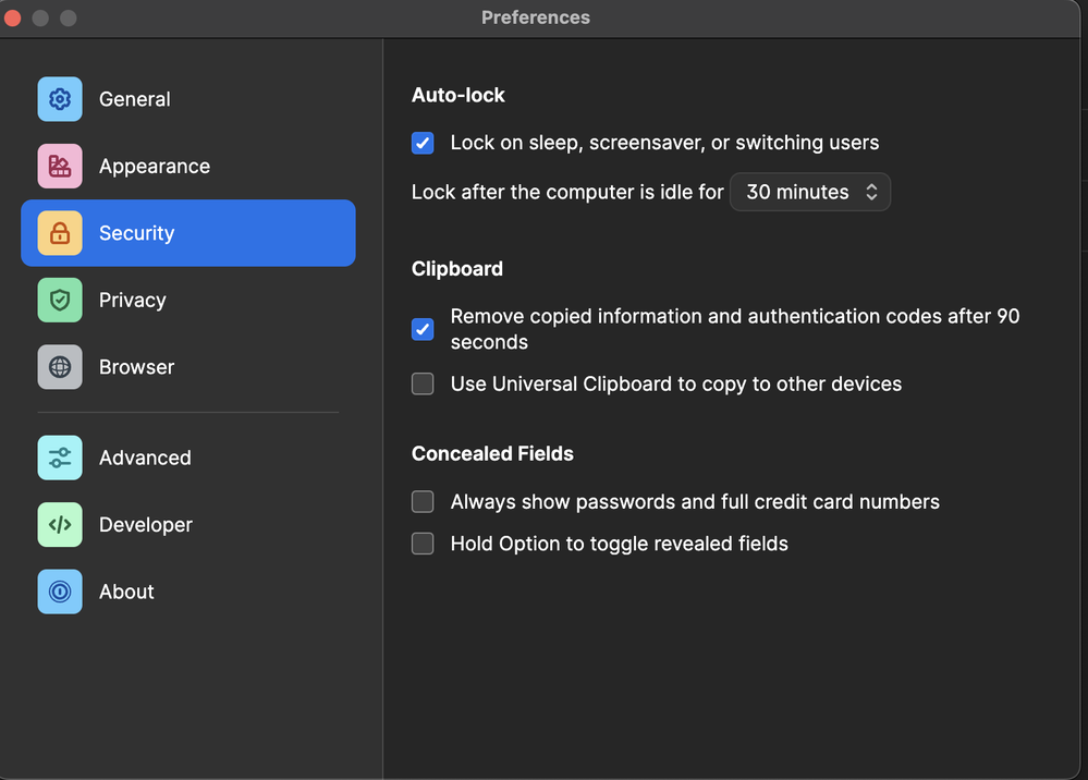 benmattison Sort of the same issue with my MacBook Air 2020; 1 Password doesn't show any "Apple Watch" setting in the security section. I'm running 80900001 beta channel. As you can see from the screen shot, there's no such setting. Am I doing something wrong? Open with Apple Watch was working great just a few days ago. - Dan