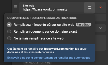 Former Member2 years agoAuto field preferences Hi ! Is there a way to make the second option the default option ? 1Password Version: 8.10.16 Extension Version: 2.15.0 OS Version: macOS 13.4.1 Browser: Chrome Show More