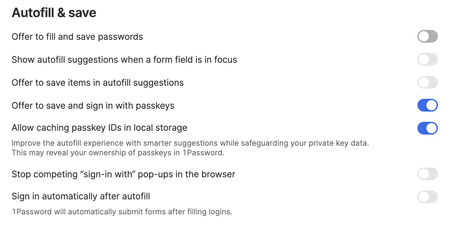 I generally use the 1Password in the browser keyboard shortcut (for me, ⌘.) to fill credentials on a website. As such, I keep the main autofill setting, "Offer to fill & save passwords," disabled: