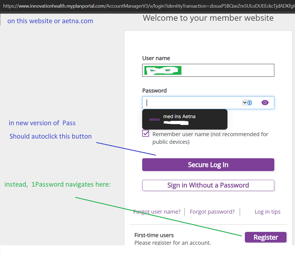 On standard aetna.com login screen when I choose the password autoclick feature clicks on Register instead of Sign In, see attached pic. How to heal?