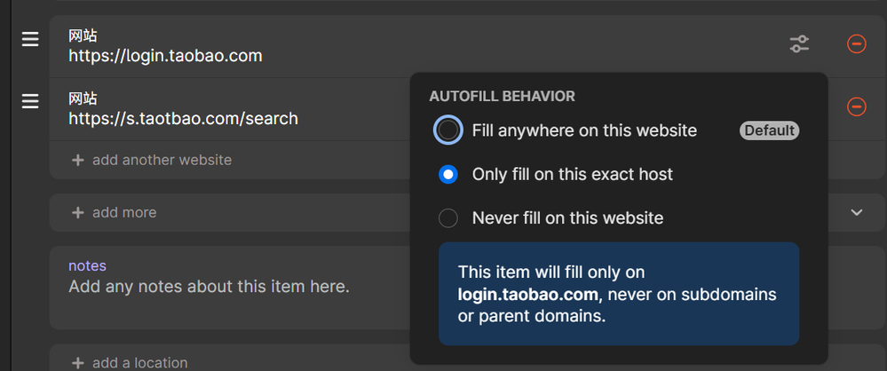 On the https://www.taobao.com, where I search, it will jump to https://s.taobao.com, but I don't like the 1password widget show on the search bar, since if I press "down" to select the recommended item, it will pop up 1password rather than select next recommended item.