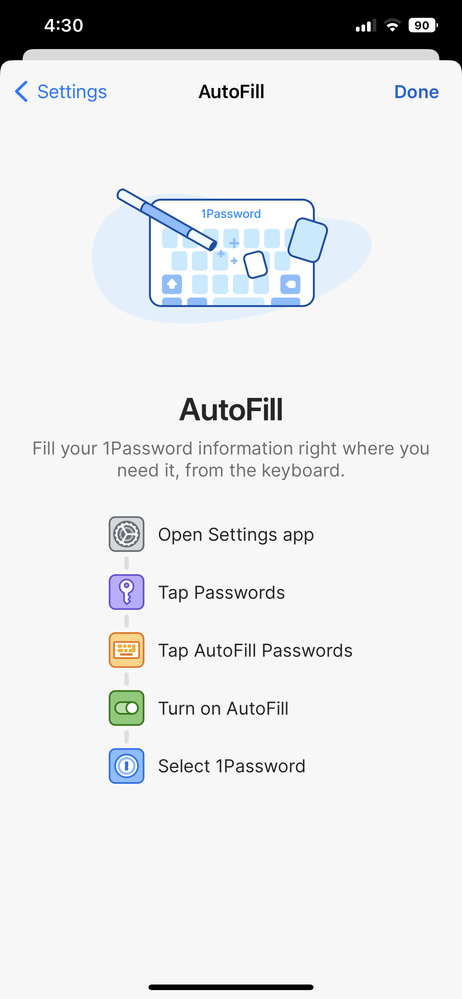 Those are the instructions for the iPhone/iPad. You'll need to enable 1Password in (iOS) Settings > Passwords (Password Options iOS 16) - Turn on Autofill - Select 1Password for autofill to work. Sounds like you might be expecting the option to be within 1Password. Please let me know more.