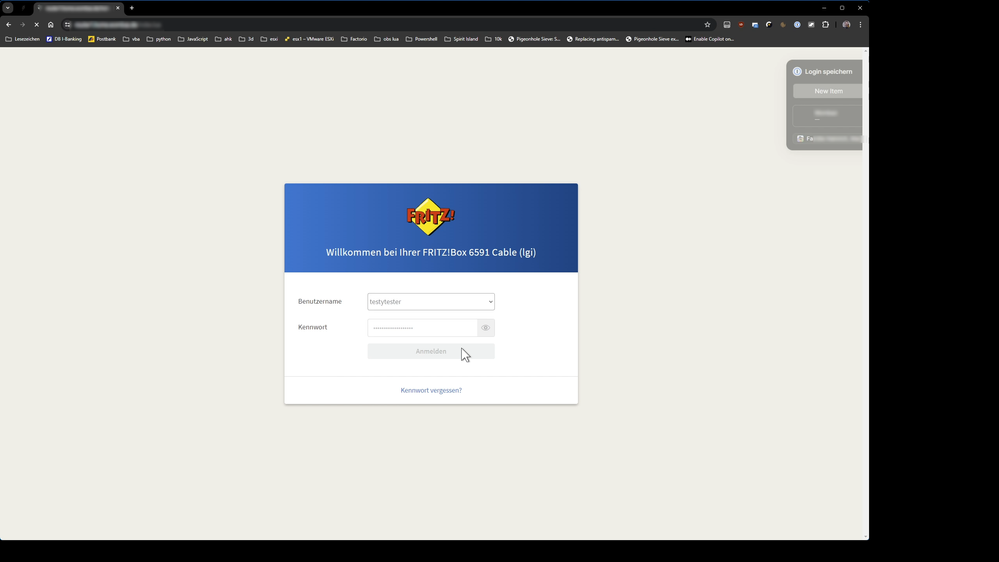 After I enter the password and click on the login button, the login proceeds and a 1Password window appears sliding in with the "new item/update existing" function. However this immediately vanishes, when the Fritz!Box refreshes its content and displays the main page. I have no chance to choose anything from that 1Password window, and it's also not possible get this window again except by logging in again, but that's vanishing again as well.