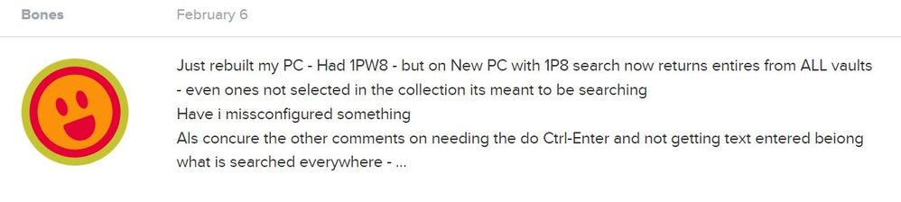 Just rebuilt my PC - Had 1PW8 - but on New PC with 1P8 search now returns entires from ALL vaults - even ones not selected in the collection its meant to be searching