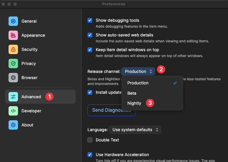 While this is the best way to get the latest from us, these releases also undergo less testing than their counterparts so if you prefer to use the Beta or Production releases, I encourage you to keep an eye on our release notes for upcoming fixes and improvements: 1Password for Mac Beta Releases