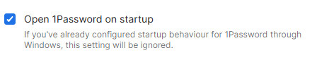 I recently noticed that ever since the last update, 1Password no longer opens on startup. I have checked my settings both in Windows and in 1Password, but it's still not opening when it's supposed to.