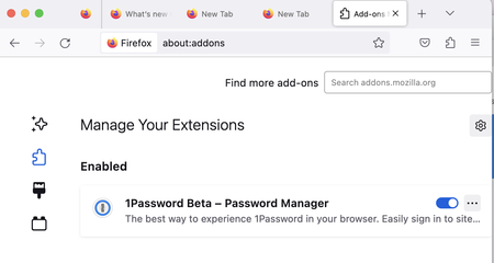 I loaded Firefox, and the 1Password browser extension was not visible. I attempted to reload it. It shows in the extensions as being active, but it is not visible.
