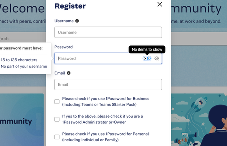 I'm sorry that 1Password isn't suggesting a new password when registering for a new account for the community. This issue is specific to websites powered by our community vendor and the team is investigating.