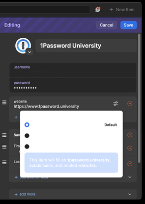 Editing a login item using dark mode has a color scheme inconsistency. When I click "autofill behavior" the resulting display box is not in dark mode; it also uses white text making it invisible. ...