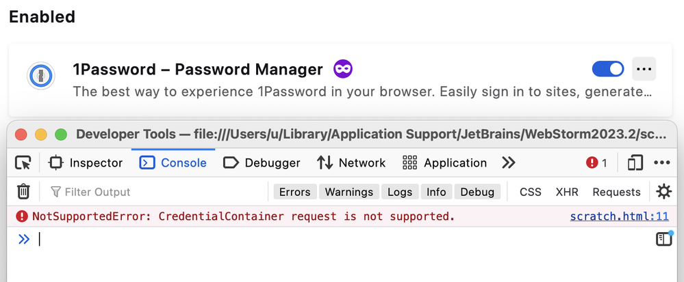 The extension breaks native navigator.credentials.get and navigator.credentials.create flow: when they throw exception (promise rejected), it's not caught by try...catch. It happens only in Firefox, other browsers are just fine.