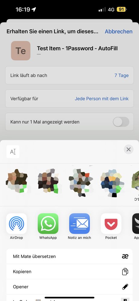 When I try to share an item via the „share“ button in the upper right corner the Sharesheet appears, which is good. But clicking an contact to send this person a link to an Item results in an empty iMessage/message