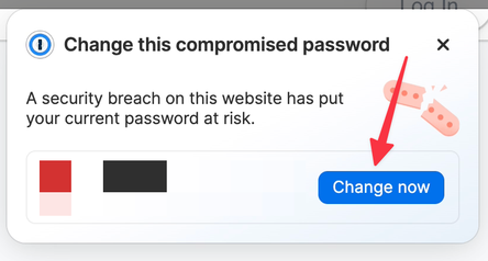 i visited a site that has a compromised password warning. the dialog/popup/toast appeared. i proceeded to the section of the site for resetting my password. when the "new password" field popped up, 1p suggested a new password, which i accepted. unfortunately the "update" dialog never appeared (update the entry in 1p), either because it was still covered by the compromised warning, or because that element prevented the update dialog from appearing.