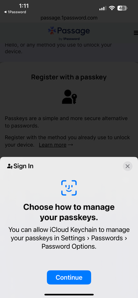 When I try to save a passkey from the browser I always get this screen instead of 1Password which is set as my password and passkey manager. Happens with iCloud, CVS.com and also on the test site whi...