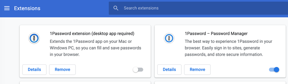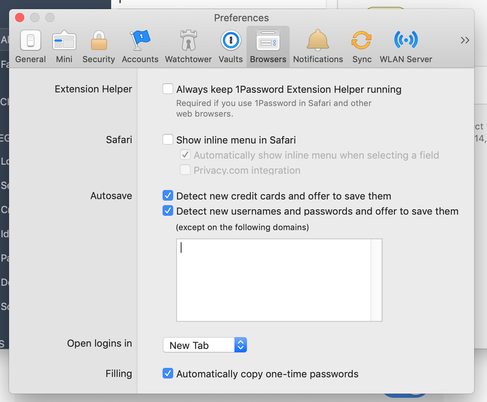 I can't attach a screenshot of my menu to this comment. When I click the photo above this comment box, something drops down but it is hidden behind this text box. As a descriptor, I right click the icon on my top menu bar (Mac) > preferences > browsers. A section is titled "Extension Helper." I can only click "always keep 1password extension helper running" but it says it's required in Safari and other web browsers. (I use Chrome.) The other section titles are Safari, autosave, open logins in, and filling. The only box I can click under 'filling' is "automatically copy one-time passwords."