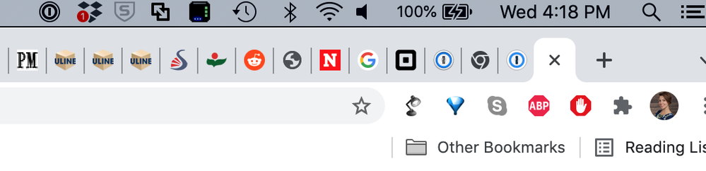 1password is pinned to my top bar on my Mac (photo) and does not show up as a Chrome extension, even though it is an extension (photo). There is also a screenshot of my preferences with some options unchecked. What am I doing wrong?