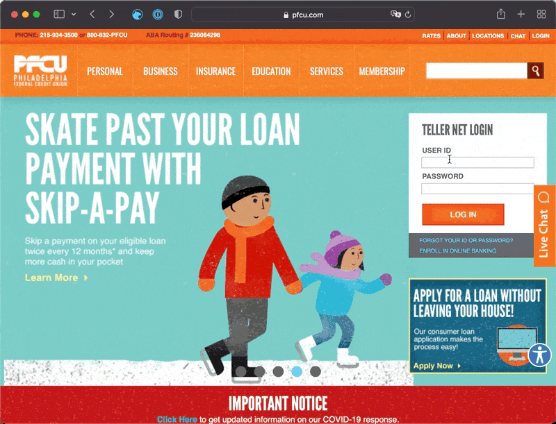 Autofill doesn't work well in the "Teller Net Login" on the front page of pfcu.com. There must be some goofy javascript in the way, but sometimes the data goes into the wrong field, sometimes it doesn't appear until clicking inside the form field, sometimes after doing a combination of clicks it works, and sometimes I need to type or copy and paste. Can this be made to work better?