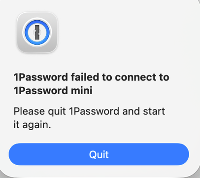 I can no longer access 1Password on my MacBook Pro, though it works fine on my iPhone and iPad. The error message I'm getting is below. I've already reached out to support and used the 1Password Troubleshooting app to generate and share logs, but haven't heard back yet. Has anyone run into this before? My support ticket ID is 572622.
