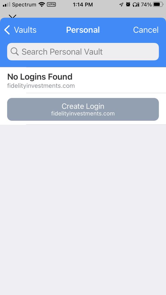 fidelityinvestments.comin the website field in your Personal vault. Is that true? If you do have a Login item for Fidelity, please make sure it has that URL in a website field saved on it. It isn't saying your vault is empty... it is saying there are no matches for the current app.Ben