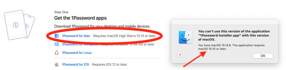 1Password 8 does require macOS High Sierra 10.15 or later. I've flagged this issue with the copy internally, so hopefully we can have it smoothed out sooner rather than later.