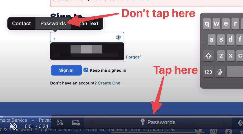 In this case, when you double-tap on a field and select AutoFill > Passwords, iOS appears to not respect that you've set another password manager for AutoFill and will instead show iCloud Keychain. This isn't a bug in 1Password itself and our team has filed a bug report with Apple. Hopefully the issue is resolved in a future update to iOS.