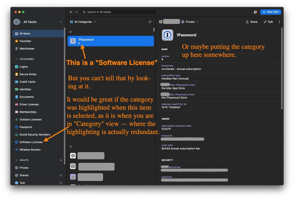 Also, since categories are required, it just seems to me that being able to readily see an item's category is, well, kind of essential. This could be accomplished by highlighting the item's Category when the item is selected. This actually happens in Category view (where it is actually redundant) but not in "All Items/All Categories" view.