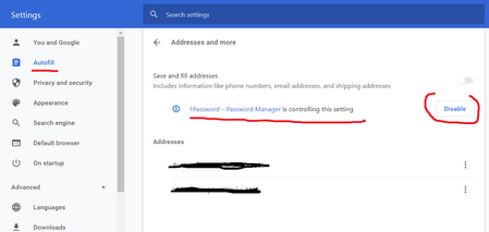 Hi, recently I started using 1Password Chrome extenstion. Password autofilling works perfectly. But common autofilling, offered by Chrome previously, stopped working. Previously, when I clicked on an...