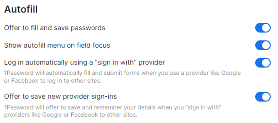 I am on a Dell XPS 13 running Windows 11. I use Chrome as my browser and have the 1password chrome extension (v2.9) installed. I noticed that the autofill wasn't working. It wouldn't suggest new passwords, autofill old ones, etc. even though I had it turned on: