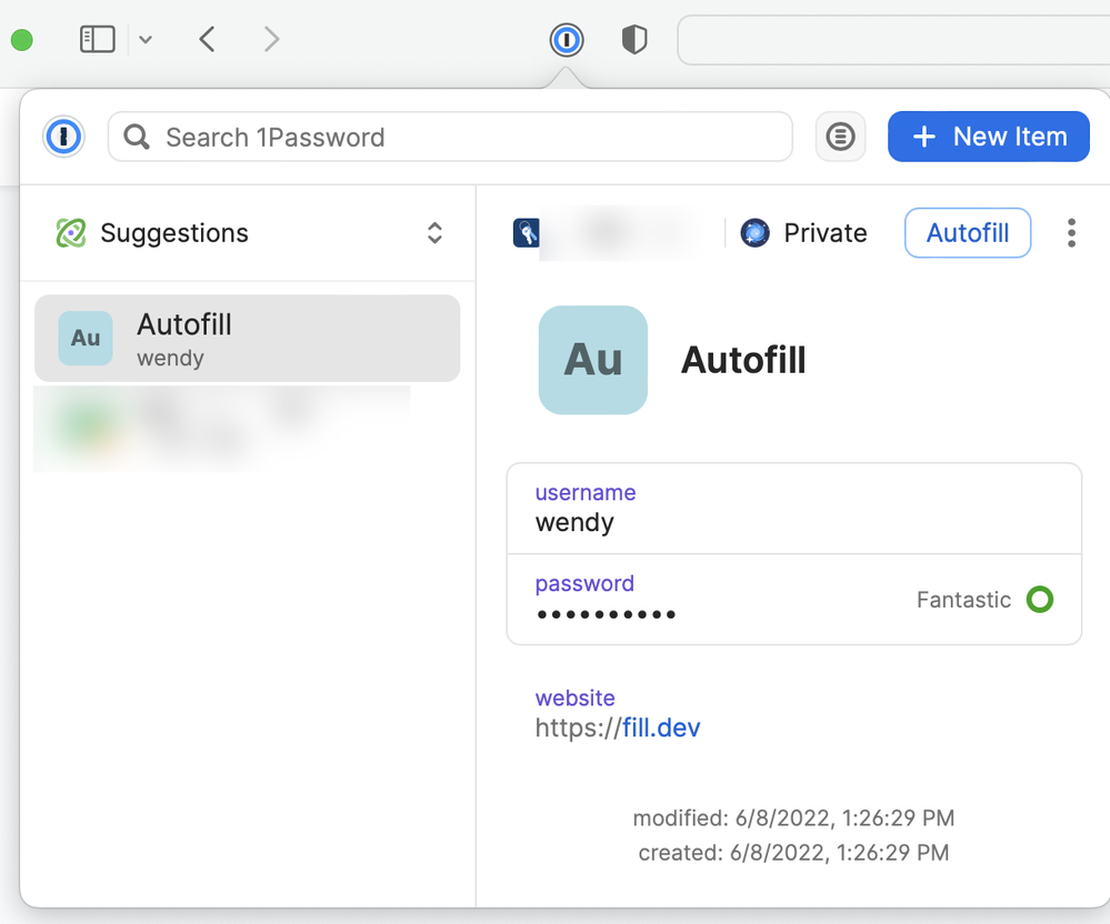 The 1Password pop-up allows for searching all of your items, and offers the Autofill button.