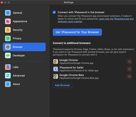Thanks for reaching out. 1Password already supports Chrome and Safari and there's no need to add them to that section, that's only for unsupported browsers that you might want to use with 1Password. I recommend that you remove "Google Chrome", "Google Chrome Beta", and "1Password for Safari" from that screen.