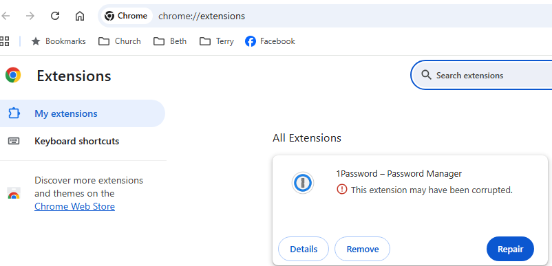Please show us the link to the "1Password PC extension" extension which you installed, explain or show what happened when you "[found] the extension has been corrupted" and what you did "to repair the extension".