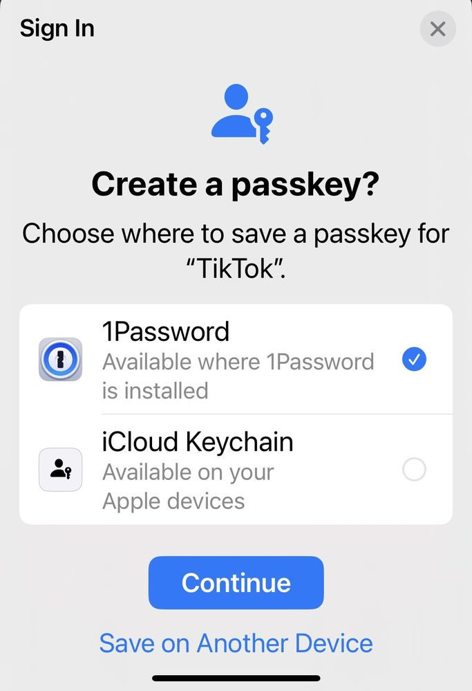 While 1Password is ready to support passkey authentication in iOS native apps, we are aware of an issue on iOS 17 that impacts users from being able to save and use passkeys to sign in to iOS apps like TikTok.